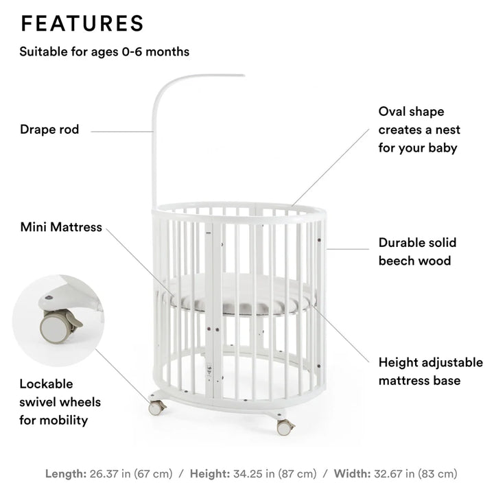 مجموعة Stokke® Sleepi™ Mini هي السرير الأول المثالي لمولودك الجديد، بما في ذلك مرتبة صغيرة (كولجيت) ومرتبة سرير لراحة تامة. تصميمها البيضاوي الناعم يُحيط طفلكِ بدفء دافئ، مما يُهيئ له بيئةً تُشبه رحم الأم لنوم هانئ. عجلاتها الدوارة القابلة للقفل تُتيح اهتزازًا خفيفًا وسهولةً في الحركة من غرفة لأخرى. تصميمها الاسكندنافي الكلاسيكي، المُوفر للمساحة، مصنوع من خشب الزان الصلب بطبقة نهائية غير سامة، وينمو مع طفلكِ من حديثي الولادة وحتى سن 5 سنوات.