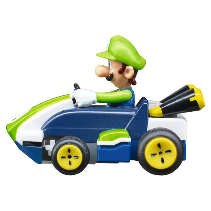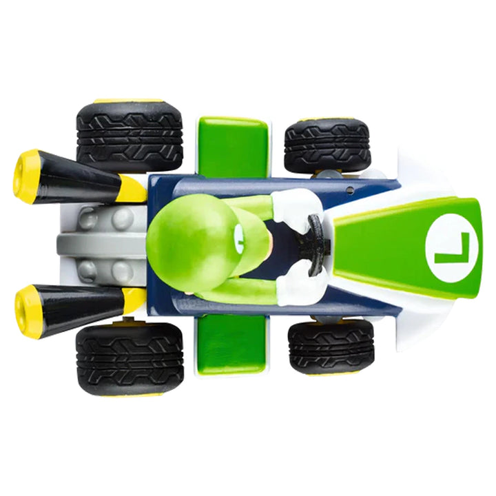 In the 2.4 GHz Mario Kart™ Mini RC, Luigi climbs into his mini kart and brings thrilling racing action directly into your living room. With three selectable speed levels and a top speed of 5 km/h, the 6.2 cm long kart adapts to every racing moment and delivers intense fun. The new, long-lasting rechargeable battery provides 15 minutes of running time and can be recharged in just 30 minutes for the next adventure.Rubber tires provide a strong grip, while Luigi and the full-function controls allow precise maneuvers even in the smallest spaces. Thanks to the Ready-to-Run feature, the mini kart is immediately ready for the first race. Packaged in an environmentally friendly paper box and officially licensed by Nintendo, Luigi is a real highlight for Mario Kart™ fans and collectors.