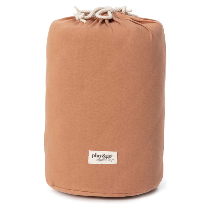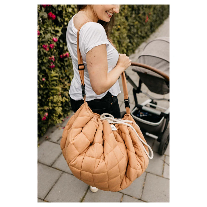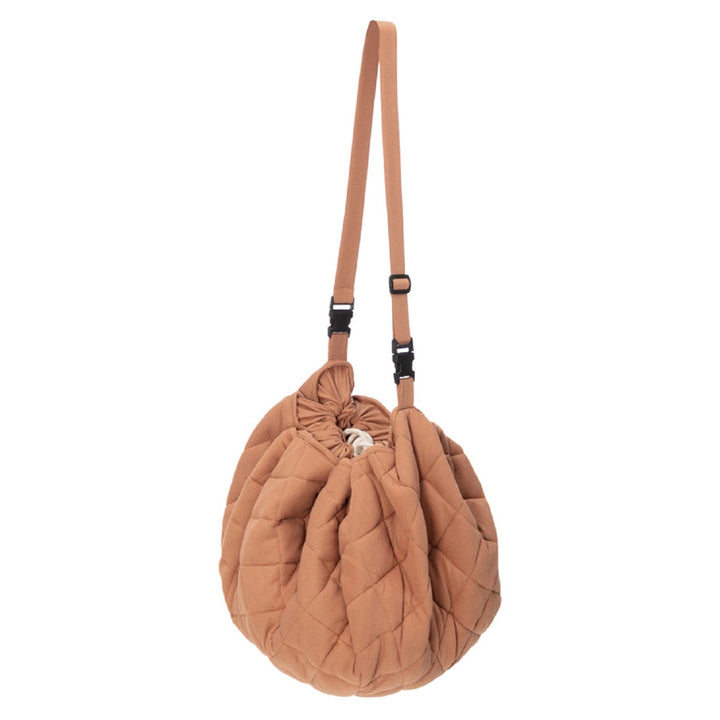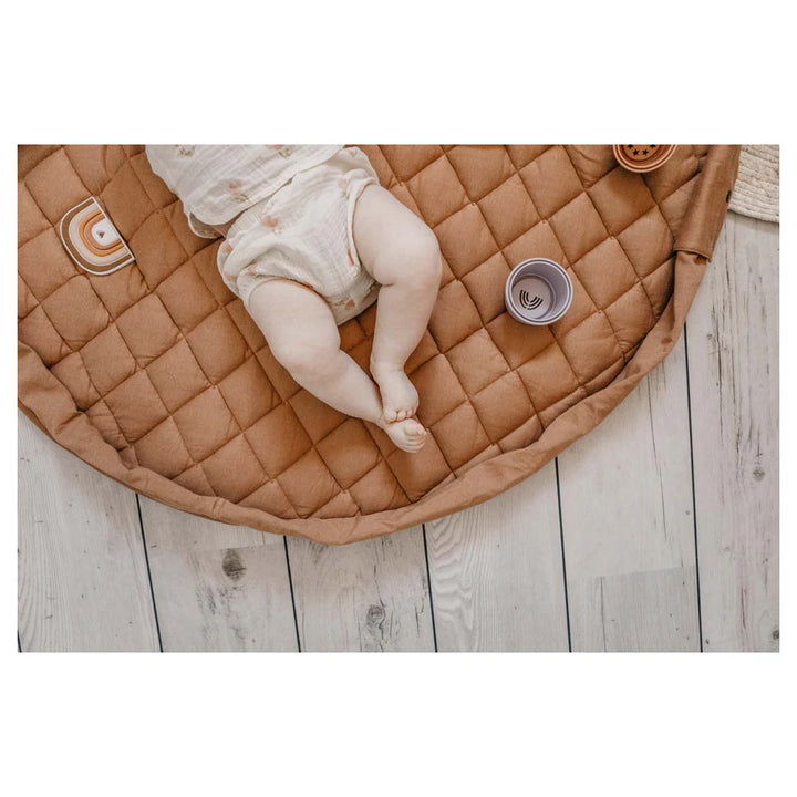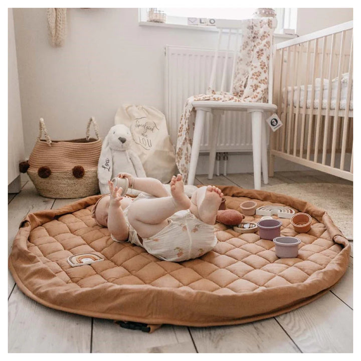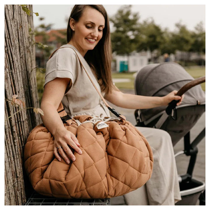 Discover this organic functional 3-in-1 babymat, storage bag, and diaper bag. This Tawny Brown GOTS organic babymat is strong, grounded, and relaxing. Inspired by the soil of the earth, Tawny Brown is a calming shade that easily combines with other colors. A unique padded baby play mat that also functions as a storage toy bag and diaper bag. Measuring 120 cm in diameter and made from GOTS organic cotton, it provides maximum enjoyment and comfort for your baby. The adjustable and removable shoulder strap guarantees great comfort, or simply hang it on the stroller and off you go!