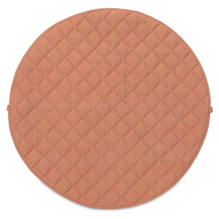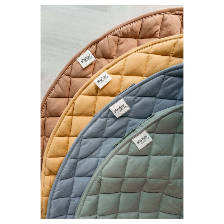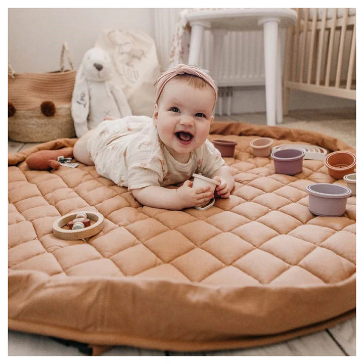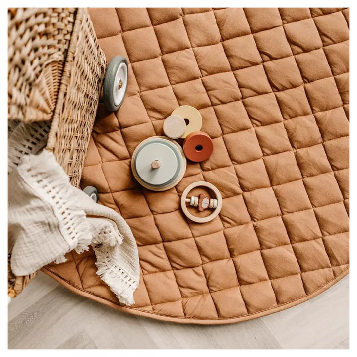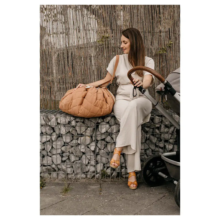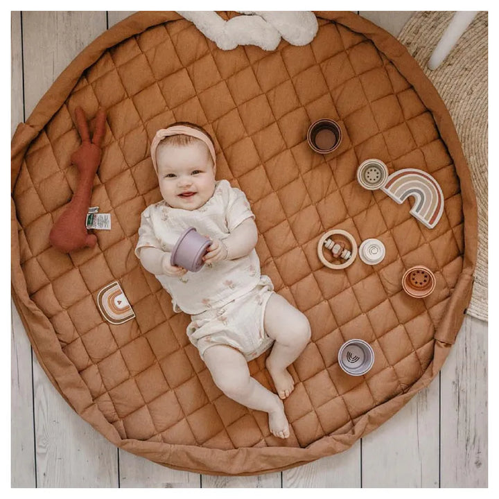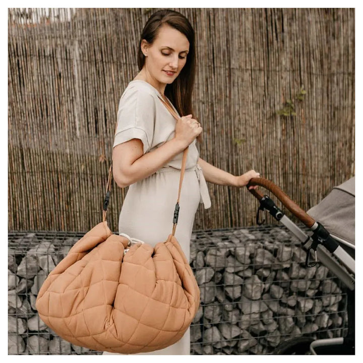 Discover this organic functional 3-in-1 babymat, storage bag, and diaper bag. This Tawny Brown GOTS organic babymat is strong, grounded, and relaxing. Inspired by the soil of the earth, Tawny Brown is a calming shade that easily combines with other colors. A unique padded baby play mat that also functions as a storage toy bag and diaper bag. Measuring 120 cm in diameter and made from GOTS organic cotton, it provides maximum enjoyment and comfort for your baby. The adjustable and removable shoulder strap guarantees great comfort, or simply hang it on the stroller and off you go!