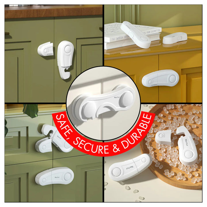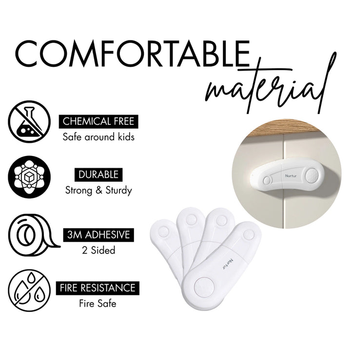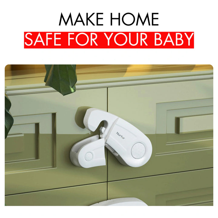 Enhance child safety with the Nurtur Child Safety Drawer Locks. This pack of two durable ABS locks prevents children from opening drawers and accessing contents. Easy to install on the exterior of drawers, they allow quick status checks while providing secure protection with strong adhesive backing (no drilling required). Ideal for securing kitchen drawers, office drawers, or bedroom dressers. Suitable for babies 6 months and above.