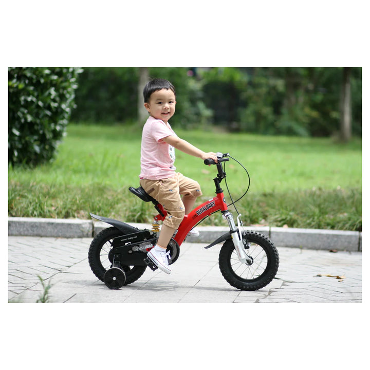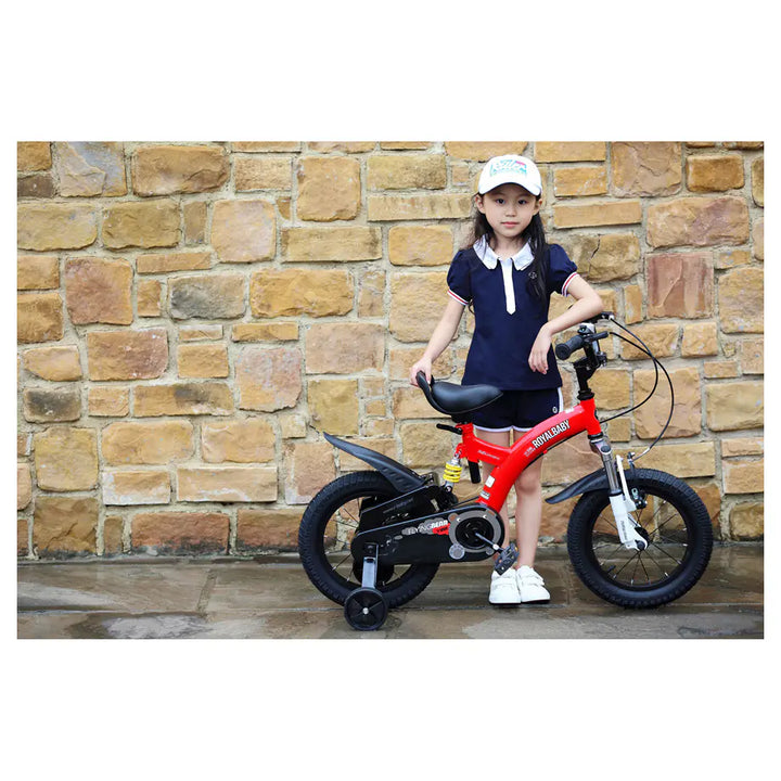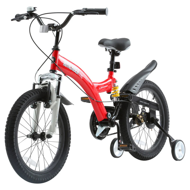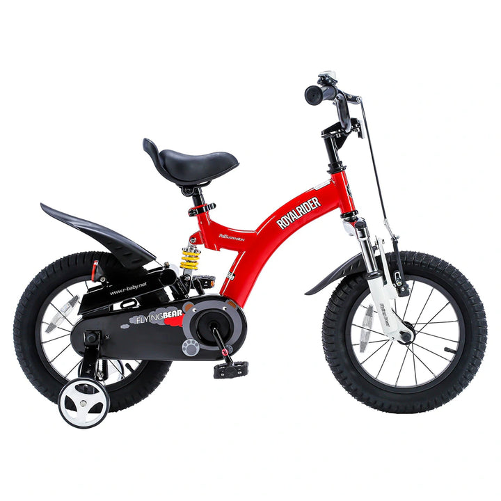 RoyalBaby Flying Bear 16IN — Red (Unisex, 4–7 years)The Flying Bear is designed for adventurous young riders who enjoy uphill, downhill, trails, pump tracks, or cruising around. It features both rear and front suspension to handle challenging rides while keeping your child comfortable and safe. Built with a sturdy TIG welded steel frame, this bike delivers durability and smooth performance for fearless adventures.